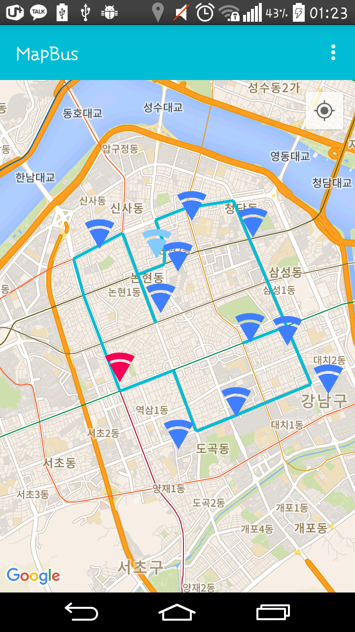 그러다 같은 과 동기의 지인으로부터 앱 개발 외주 제안을 받게 되었다. 앱의 내용은 구글 지도 상에서 실시간으로 추가/변경되는 경유지를 포함하는 최적의 경로를 표시하고 시뮬레이션 하는 것이었다. 당시에 앱 개발 경험도 부족하고 자바 또한 잘 몰랐던 나로서는 매우 무모한 선택이었지만, 상업용 출시가 아닌 프로토타입 정도의 확인만을 목표로 하셨기에 흥미롭게 제안을 수락했다. 나름 열심히 구글링하고 문서를 읽어가며 어떻게든 앱에 구글 지도를 띄우고, 마커와 경로를 표시하고, 길찾기 알고리즘을 적용해 개발했다. 구글 지도는 국내에서 대중교통 외 길찾기 기능이 제공되지 않았기에 직접 강남 일대 주요 도로에 대한 데이터를 직접 작성했다. 굉장히 단순하고 볼품없지만 어쨌든 주어진 요구사항과 날짜를 맞춰 완료했고, 약간의 용돈도 생겼다.